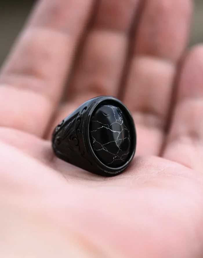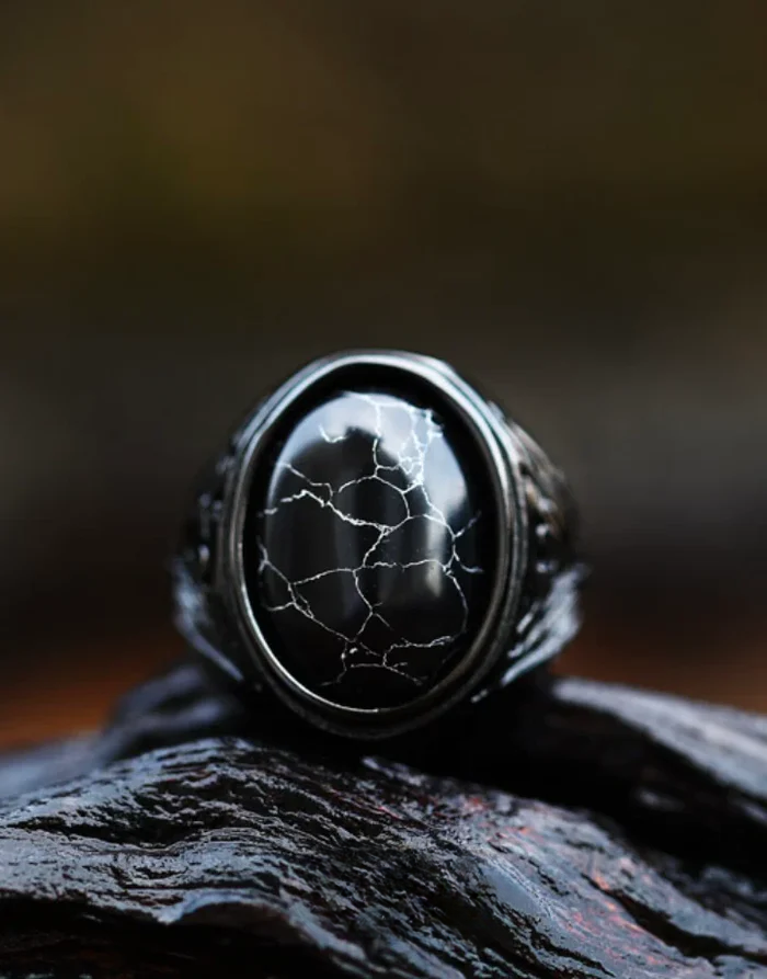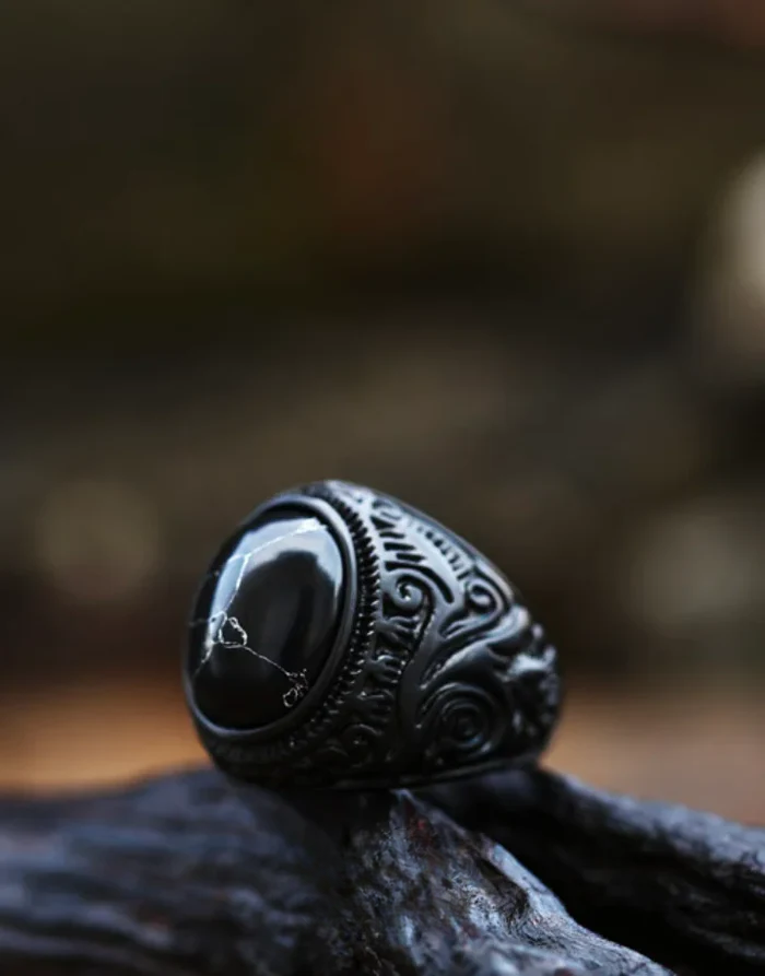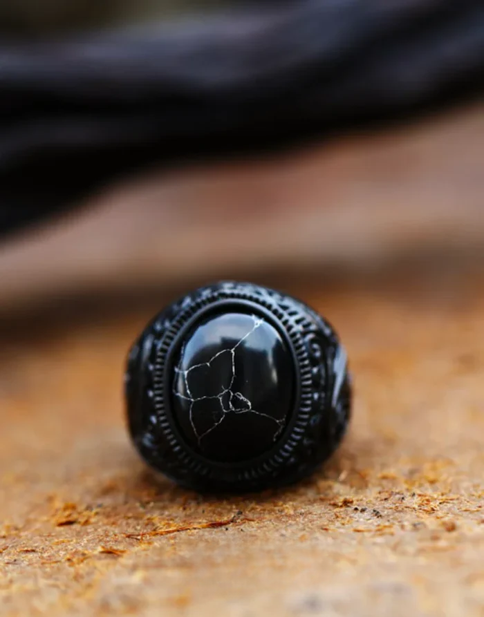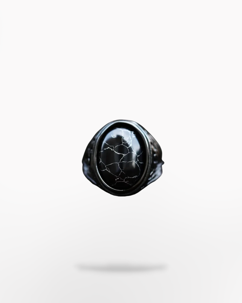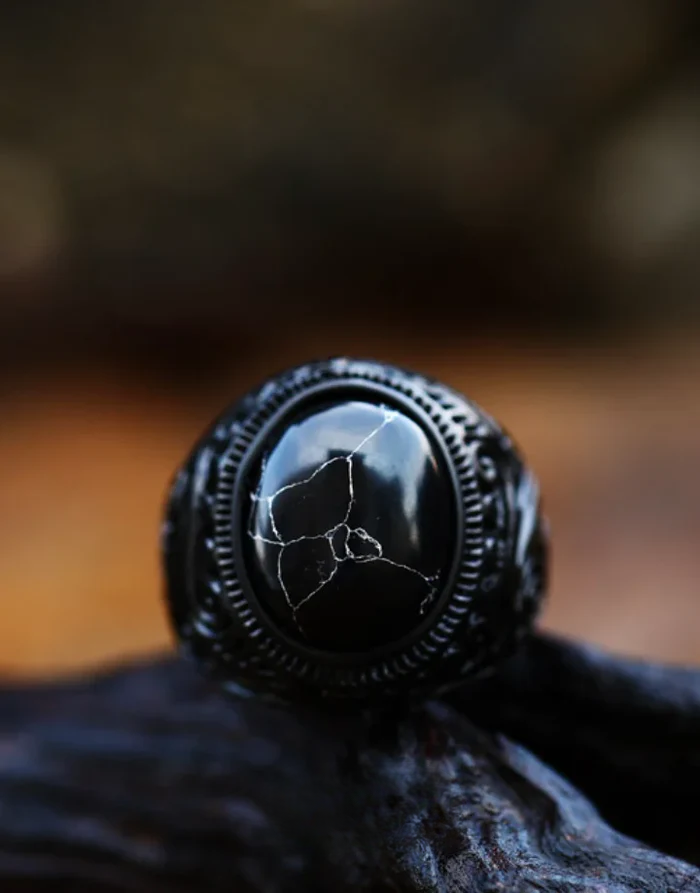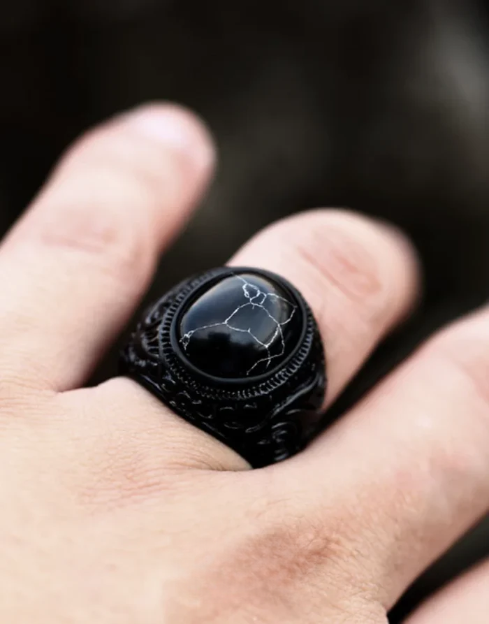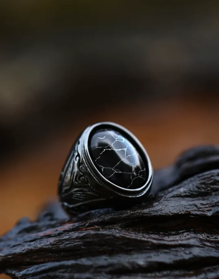 Experience the perfect blend of rugged masculinity and refined gothic style with this techwear black turquoise ring.