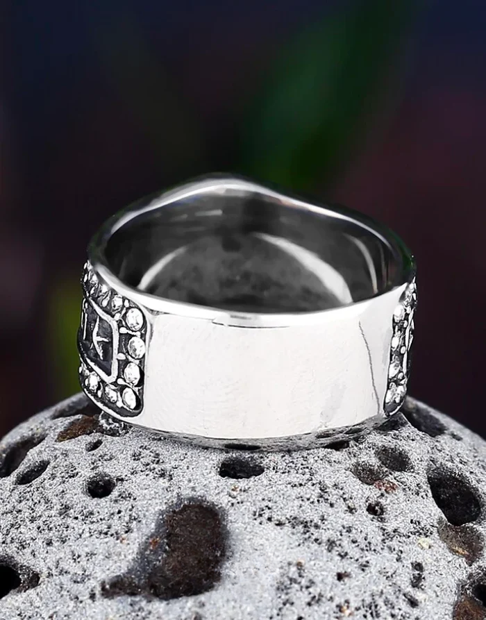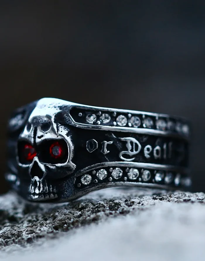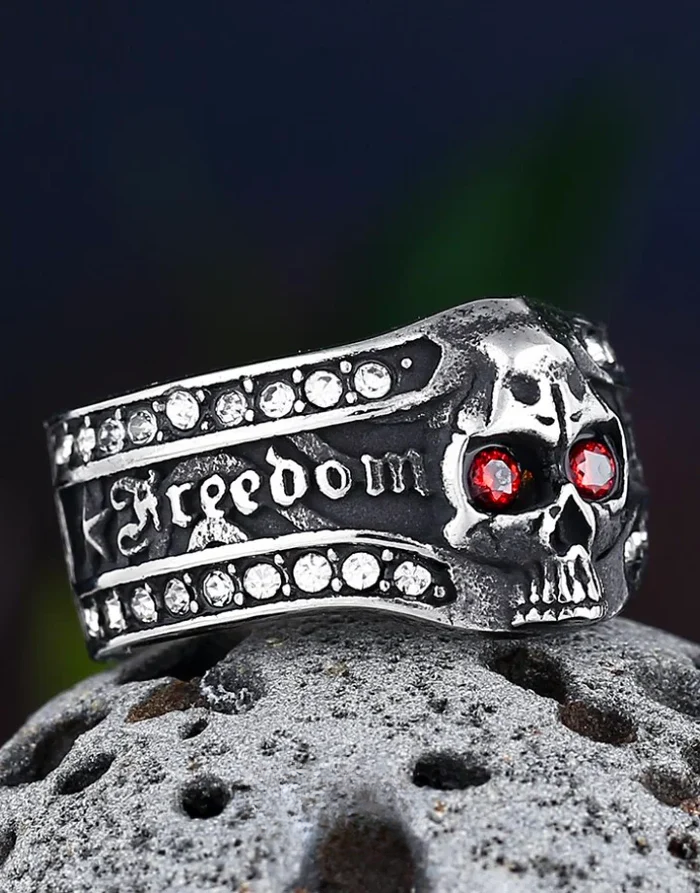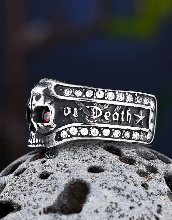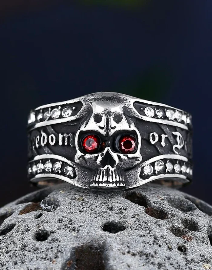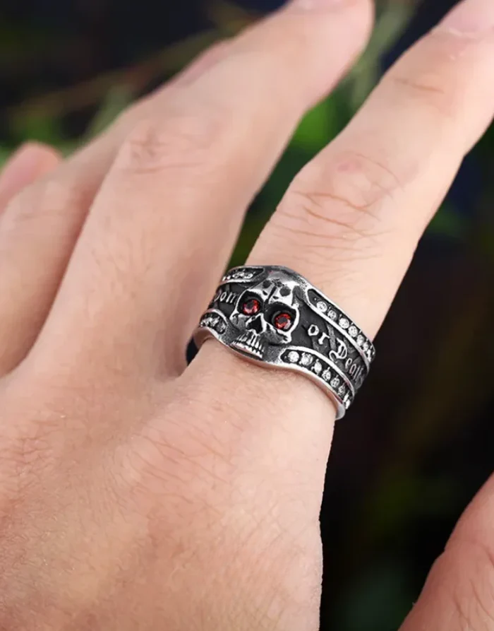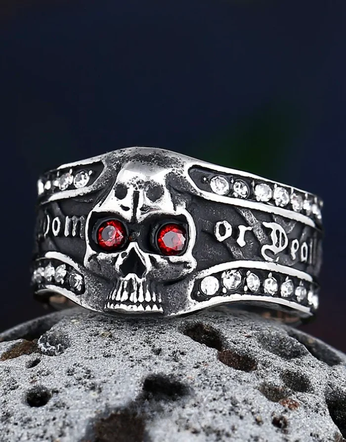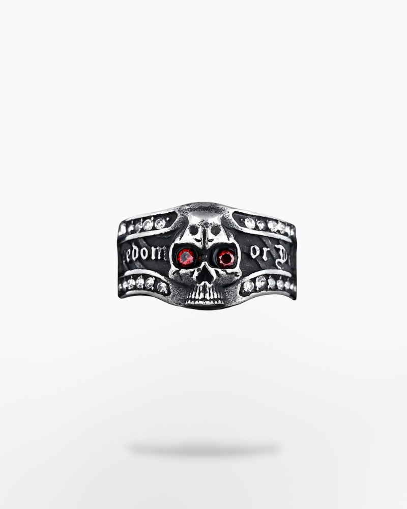 This techwear freedom or death ring combines gothic style and striking red stones to create the perfect statement piece.