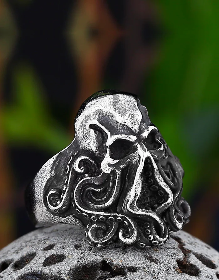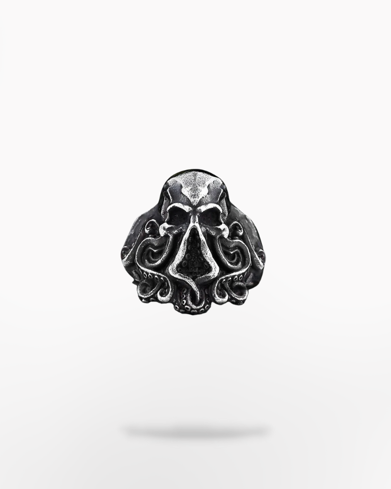 This Techwear Octopus Skull Ring introduces a unique, flowing form to your hand, balancing the angular power of the accompanying skull ring.