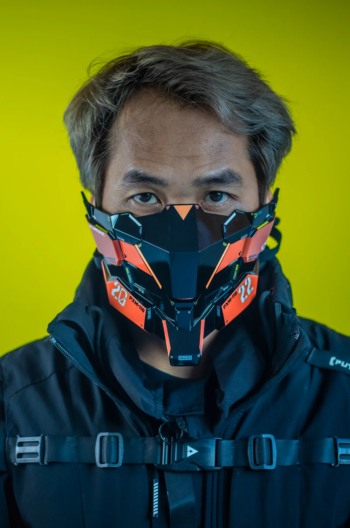 This techwear orange cyberpunk mask is built to operate in volatile environments where reaction time matters. The design blends warning aesthetics with precision armor.